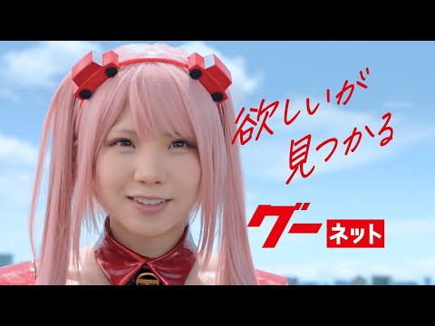 新CMは、車のコスプレをしたえなこさんが、屋上から「欲しいが見つかるグーネット!」と繰り返し、街の人に呼びかける。