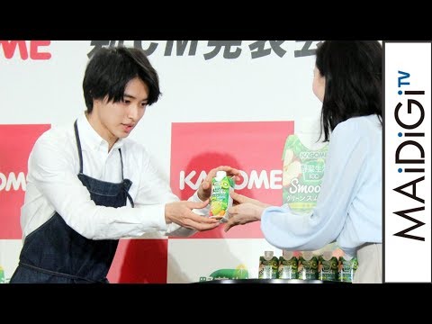 俳優の山崎賢人さんが3月19日、東京都内で開かれたカゴメ「野菜生活100 Smoothie(スムージー)」新CM発表会&ヘルシースナッキング大使就任式に登場。山崎さんは、ヘルシースナッキング大使として、新商品のサンプリングも行った。