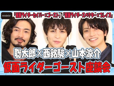 特撮ドラマ「仮面ライダーゴースト」(2015~16年)と「仮面ライダーセイバー」(テレビ朝日系、日曜午前9時)のスピンオフ「仮面ライダーセイバー×ゴースト」「仮面ライダースペクター×ブレイズ」が、アプリサービス「東映特撮ファンクラブ(TTFC)」で独占配信中だ。仮面ライダーゴースト/天空寺タケル役の西銘駿さん、仮面ライダースペクター/深海マコト役の山本涼介さん、ジャベル役の聡太郎さん、マコトの妹・深海カノン役の工藤美桜さんらオリジナルキャストの出演も話題の両作。撮影では、口をそろえて「工藤さんの成長を実感できた」という西銘さん、山本さん、聡太郎さんに、「ゴースト」の思い出やスピンオフについて話を聞いた。