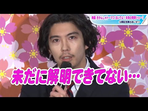 俳優の賀来賢人さんが3月27日、東京都内で行われた劇場版アニメ「映画 きかんしゃトーマス おいでよ!未来の発明ショー!」の公開記念舞台あいさつに、お笑いコンビ「ジャルジャル」の後藤淳平さんとともに登場した。