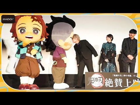 吾峠呼世晴(ごとうげ・こよはる)さんの人気マンガが原作のアニメ「鬼滅の刃」の劇場上映企画「ワールドツアー上映『鬼滅の刃』絆の奇跡、そして柱稽古へ」の公開記念舞台あいさつが2月2日、TOHOシネマズ日比谷(東京都千代田区)で開催され、竈門炭治郎役の花江夏樹さん、不死川玄弥(げんや)役の岡本信彦さんら声優陣が登場した。ワールドツアー上映では、新作テレビアニメ「テレビアニメ『鬼滅の刃』柱稽古編」の第1話が世界初公開された。「柱稽古編」では、玄弥が炭治郎ら同期の鬼殺隊隊士と過ごすシーンが描かれるといい、岡本さんは「同期の輪にようやく入れるのはうれしかったですね」と喜びを語った。