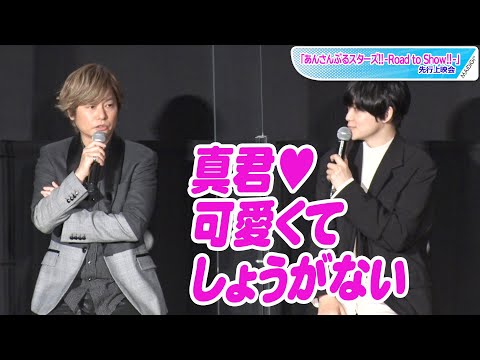 人気スマートフォン用ゲームが原作のアニメ「あんさんぶるスターズ!!」の完全新作「あんさんぶるスターズ!!-Road to Show!!-」の先行上映会が2月26日、新宿ピカデリー(東京都新宿区)で開催され、遊木真役の森久保祥太郎さんら声優陣が登場した。森久保さんは、新作で注目してほしいシーンを聞かれると「頑張っていましたよ、真君! 真君を通じてやったことがない芝居、こんな真君を初めてやった!というシーンもありました」と話し、「可愛くてしょうがない!」と真への愛を語った。