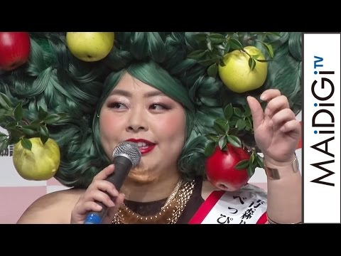 お笑いタレントの渡辺直美さんが9月26日、東京都内で行われた青森りんごをPRするプロジェクト「青森りんごでべっぴん倍増計画」に出席。昨年に続き同プロジェクトの実行委員長に就任した渡辺さんはりんごの女神をモチーフにした「巨大なりんごアフロヘアー」で登場した。