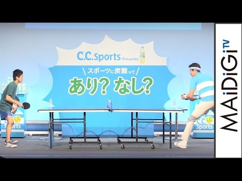 松岡さんは、卓球とバドミントンのジュニア選手とともに真剣勝負を行って、スポーツ中の炭酸がありかなしか、実際に飲んで検証した。松岡さんは、卓球のジュニア選手との試合では、「新常識で戦おう。5ポイント先取で、そっちは(速いスピードで)決めちゃいけない」「試合中は音楽いらないよ!」「こっちが全部サーブ、回転かけないで」と、どんどんハンデを要求して、「いい試合になってきたぞ」とつぶやいて、会場の笑いを誘った。