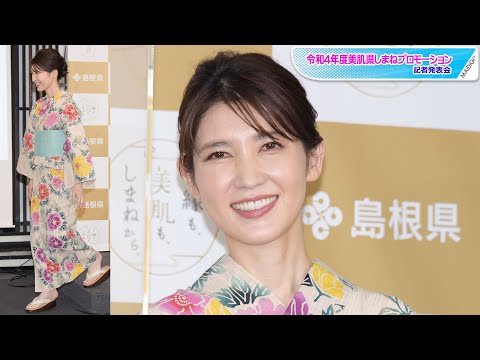 内科・皮膚科医でタレント、美容・健康についてのYouTubeチャンネルも話題の友利新(ともり・あらた)さんがこのほど、東京都内で行われた島根県をPRする「令和4年度美肌県しまねプロモーション」の記者発表会に出席した。生成り色に赤や黄、紫の花柄があしらわれた浴衣姿で登場。水色の帯が爽やかさをプラスしていた。