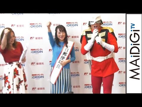 アニメ「機動戦士ガンダム THE ORIGIN」でセイラ・マス役の声優を務めた潘めぐみさんが5月15日、東京中央郵便局(東京都千代田区)で開催された「機動戦士ガンダムTHE ORIGIN <シャア・セイラ編>フレーム切手セット 」発売記念イベントに出席。潘さんは一日郵便局長も務めた。イベントにはシャアのものまねで人気のぬまっちさん、MCで元SKE48の古川愛李さんも登場した。