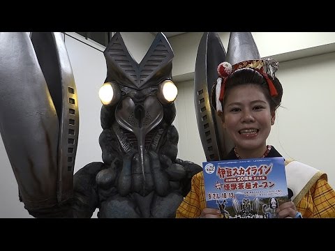 円谷プロダクションの特撮ヒーロー「ウルトラマン」シリーズの怪獣をテーマにした「怪獣茶屋」が27日から10月13日まで、伊豆スカイライン内の「スカイポート亀石」(静岡県伊東市)にオープンするに当たり、店長のバルタン星人と伊豆の踊子が9月12日、毎日新聞デジタル「まんたんウェブ」編集部を訪れPRした。