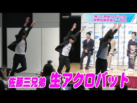 肝炎に関する啓発活動を行う「知って、肝炎プロジェクト」の応援インフルエンサーを務める「佐藤三兄弟」が7月29日、東京都内で行われた「知って、肝炎プロジェクト 世界・日本肝炎デー2021」に登場し、生アクロバットを披露した。