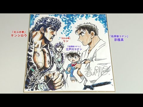 イラストは、ケンシロウと京極真が向かい合い、コナンとリンが2人を見守るという豪華な描き下ろし。原さんは「(青山さんに)謎解きのやり方を教わりたい」、青山さんは「(原さんは)拳法モノの基本をつくった方だと思います」と、互いに尊敬の念を語り合いながら描いていったという。完成した色紙を見た青山さんは「ケンシロウだ! 俺が欲しい!」と感動した様子。原さんは「青山先生が最初に体を描いちゃったので、大変なことになっちゃいました(笑い)。(ケンシロウは)体を描くのが大変なので(笑い)」 とコメントし、奇跡のコラボが実現した。