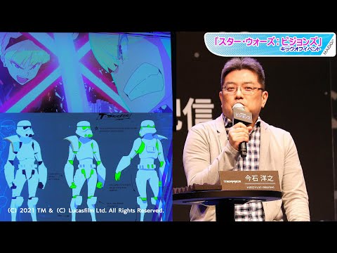 「スター・ウォーズ:ビジョンズ」は、トリガー、神風動画、キネマシトラス、サイエンス SARU、ジェノスタジオ、スタジオコロリド、プロダクション I.Gのアニメ制作会社7社が、それぞれオリジナル短編アニメを制作するプロジェクト。イベントには、今石監督のほか、水崎淳平総監督、垪和等監督、チェ・ウニョン監督、ベル・ゴンゴラ監督、五十嵐祐貴監督、木村拓監督、大塚雅彦監督、神山健治監督という各短編作品の監督が集結した。ゲストとしてモデルの市川紗椰さんも登場。