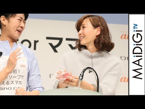 イベントでは、実演販売士のバンビーナ神村さんによる世界初のハンドソープで洗えるスマートフォン「DIGNO rafre」のプレゼンも行われた。