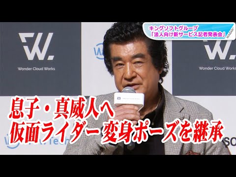 発表会では、12月17日に公開される人気特撮ドラマ「仮面ライダー」シリーズの50周年記念映画「仮面ライダー ビヨンド・ジェネレーションズ」に長男の藤岡真威人(まいと)さんが出演し、仮面ライダー1号/本郷猛を演じる話題に触れ、藤岡弘、さんは「奇跡なようなこと。感謝している」と明かした。