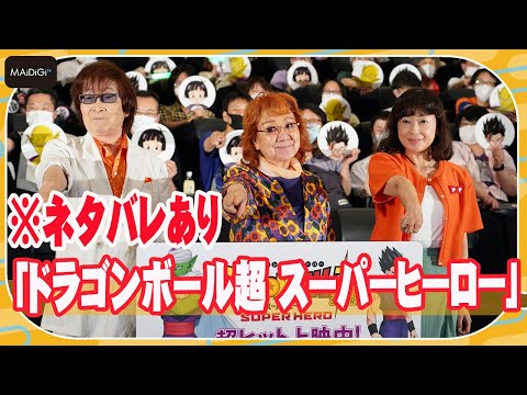 鳥山明さんのマンガが原作の人気アニメ「ドラゴンボール」の21作目となる劇場版アニメ「ドラゴンボール超(スーパー) スーパーヒーロー」の舞台あいさつが7月9日、新宿バルト9(東京都新宿区)で開催され、孫悟空、悟飯、悟天役の野沢雅子さん、ピッコロ役の古川登志夫さん、ビーデル、パン役の皆口裕子さんが登場した。この日は“ネタバレ解禁”でトークすることになり、野沢さんらが、劇場版に登場する孫悟飯ビースト、オレンジピッコロ、セルマックスについて語った。