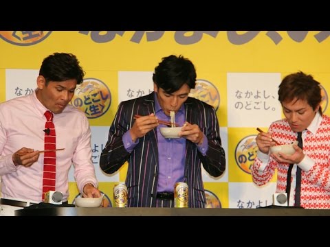 発表会では、2014年から同CMのキャラクターを務めている俳優の堺雅人さんに加え、「おぎやはぎ」の矢作兼さん、照英さん、要さん、狩野さんを新たなCMキャラクターに迎えた新CM「なかよし、のどごし。」もお披露目された。CMは10日から全国で放送される。