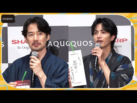 俳優の竹野内豊さんと志尊淳さんが7月3日、東京都内で行われたSHARPのスマートフォン「AQUOS」新CM完成披露イベントに登場。2人は浴衣姿で登場し、七夕の願いごとを披露した。