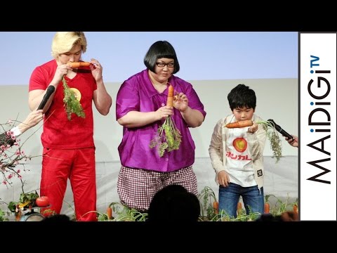 この日は、ボンカレー新商品の「ボンカレーゴールド」と「こどものためのボンカレー」の発表会。3人は、会場に設置された国産野菜の穫れる「ボンカレーファーム」で収穫を疑似体験したほか、新商品を試食して、誰が一番うまく味を伝えられるか、食レポ対決を行った。