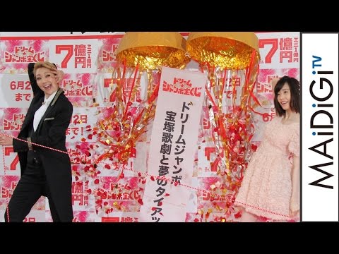 アイドルグループ「AKB48」の元メンバー・島崎遥香さんが10日、東京都内で行われた「ドリームジャンボ宝くじ」の発売記念イベントにCMで共演した宝塚歌劇団星組の紅ゆずるさんと俳優の役所広司さんと登場した。