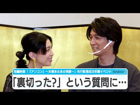 女優の雛形あきこさんと俳優の天野浩成さん夫婦が3月31日、東京都内で行われた夫婦役で出演する短編映画「『アンコン』~夫婦あるある物語~」の先行配信成功祈願イベントに登場した。
