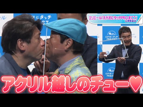 発表会では、人との触れ合いの重要性をアピールするため、実際に相手の手をなでる「タッチング」を実践。寺門ジモンさんが上島竜兵さんとリーダーの肥後克広さんのタッチングで、どちらがよかったかを話す際に、上島さんと寺門さんが言い合いになり、キスして仲直りする定番ギャグを、アクリル板を使って披露した。