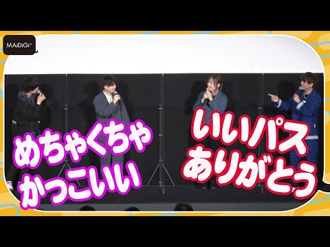 舞台あいさつには、潔世一(いさぎ・よいち)役の浦和希さん、蜂楽廻(ばちら・めぐる)役の海渡翼さん、千切豹馬(ちぎり・ひょうま)役の斉藤壮馬さんも登壇した。