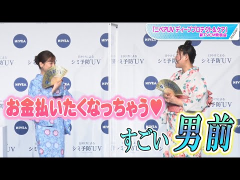 発表会には、お笑いコンビ「ガンバレルーヤ」のまひるさん、よしこさんも登場。田中さんらは、日本舞踊にインスパイアされたという、日焼けによるシミを防ぎながら美しいうなじが映える「艶肌(あではだ)所作」を、日本舞踊家の睦静紀(むつみ・しずき)さんから教わった。田中さんが浴衣姿で出演するテレビCMは、12日から全国で放送される。