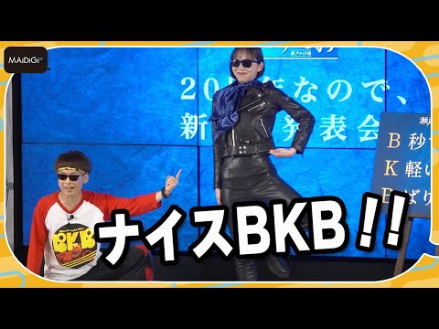 俳優の井桁弘恵さんとお笑い芸人のバイク川崎バイクさんが6月9日、東京都内で行われた「栗山米菓 瀬戸しお #20周年なので 新CM発表会」に登場した。