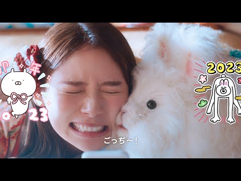 新CMは「どのスタンプ送る?」編、「最高の返しはどれだ!」編、「ウサギの好きなスタンプは?」編の3種類で、2023年の干支(えと)の“うさぎ”にあわせて、朝日さんがアンゴラウサギとお正月にのんびり過ごしながら、「あけおめLINE」でどの「あけおめスタンプ」を友達に送るかを可愛く迷う様子などを描いている。