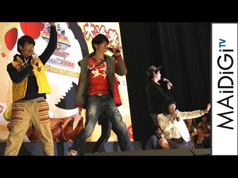 試写会には、「動物戦隊ジュウオウジャー」に出演している中尾暢樹さん、柳美稀さん、南羽翔平さん、渡邉剣さん、立石晴香さん、國島直希さんも出席した。多和田さんは、撮影中のエピソードとして「テストでギャグを披露したら、ジュウオウジャーのみんなが引いていた」と明かすと、中尾さんらが「キンジのテンションに付いていけなかった」と苦笑し、矢野さんから「私たちも付いていけなかったよ」と言われ、肩を落としていた。