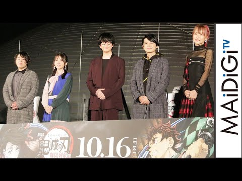 イベントには、竈門禰豆子(かまど・ねずこ)役の鬼頭明里さん、我妻善逸(あがつま・ぜんいつ)役の下野紘さん、嘴平伊之助(はしびら・いのすけ)役の松岡禎丞さん、主題歌「炎(ほむら)」を担当する歌手のLiSAさんが登場した。