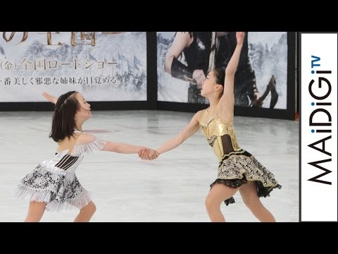 映画は、白雪姫の継母・ラヴェンナ女王と、その妹のフレイヤ女王を描いた物語。望結ちゃんはラヴェンナ女王をイメージしたゴールド、紗来ちゃんはフレイヤ女王をイメージしたシルバーの衣装でスケートリンクに登場。映画をモチーフに「強い感じを表現した」という望結ちゃん考案の振り付けで、約2分間にわたって、ジャンプやスピンなど華麗な滑りを披露した。イベントにはお笑いコンビ「ロッチ」もゲストで登場した。