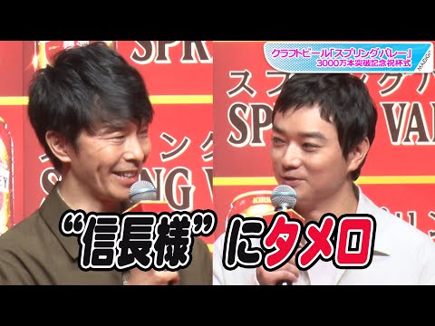 俳優の長谷川博己さん、染谷将太さんが9月16日、東京都内で行われたキリンビールのクラフトビール新商品「SPRING VALLEY 豊潤<496>」のイベント「クラフトビール『スプリングバレー』3000万本突破記念祝杯式」に登場した。