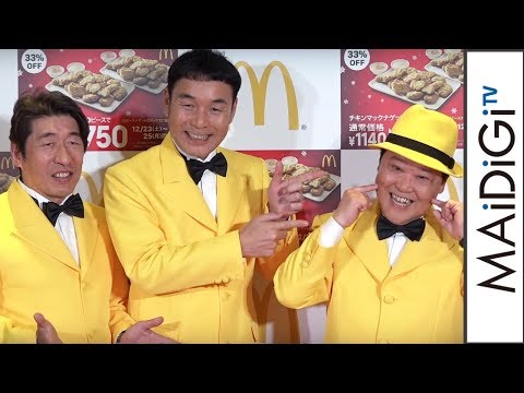 お笑いトリオ「ダチョウ倶楽部」が12月21日、東京都内で開催れたマクドナルドの「チキンマックナゲット」クリスマスキャンペーン発表会に出席した。発表会にはダンディ坂野が扮(ふん)する“怪盗ナゲッツ”も登場した。
