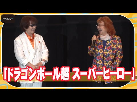 鳥山明さんのマンガが原作の人気アニメ「ドラゴンボール」の21作目となる劇場版アニメ「ドラゴンボール超(スーパー) スーパーヒーロー」の舞台あいさつが7月9日、新宿バルト9(東京都新宿区)で開催され、孫悟空、悟飯、悟天役の野沢雅子さん、ピッコロ役の古川登志夫さん、ビーデル、パン役の皆口裕子さんが登場した。
