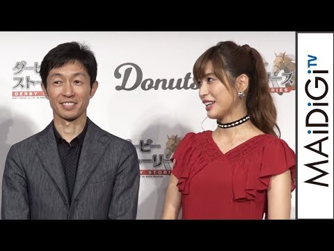 タレントの大島麻衣さんと武豊騎手が9月7日、スマートフォン向けゲーム「ダービーストーリーズ」の発表会に出席。発表会にはゲーム内で実況を担当した中野雷太アナウンサーも登場した。
