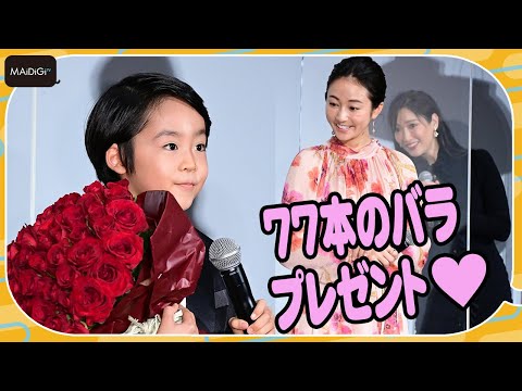 女優の木村文乃さんが10月17日、東京都内で行われた、公開中の主演映画「七人の秘書 THE MOVIE」(田村直己監督)の舞台あいさつに登場した。19日に35歳の誕生日を迎える木村さんへのバースデーサプライズとして、子役の川原瑛都(えいと)君が77本のバラをプレゼントすると「めちゃくちゃうれしいです。実は私、バラの花束もらったの初めて」と笑顔をはじけさせた。